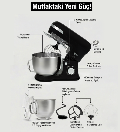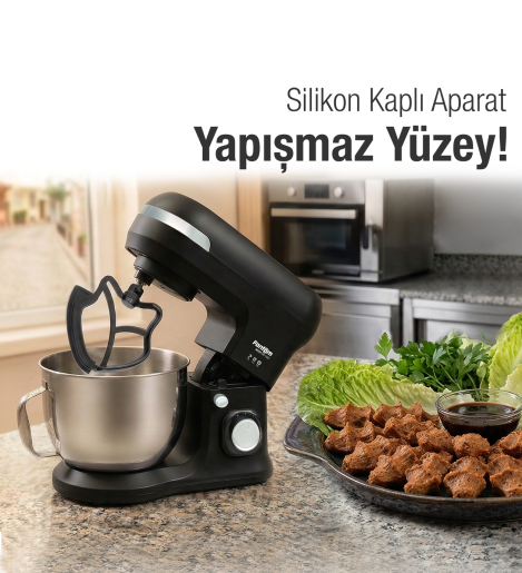 NFEST HM 1500 Hamur Yoğurma Makinesi 1500 W güçlü motoru ve metal dişli sistemi sayesinde hamur yoğurmadan çırpmaya, çiğköfte yoğurmadan kek karışımlarına kadar tüm tariflerde üstün performans sağlar. 304 paslanmaz çelikten üretilmiş 6.7 litre yapışmaz haznesi, tek seferde yüksek miktarda hazırlık yapmanıza imkan tanır. Alüminyum + teflon kaplamalı karıştırıcı ve kanca aparatı ile paslanmaz çelik çırpıcı aparatı; farklı tarifler için çok yönlü kullanım sağlar. 6 hız ayarı ve Pulse özelliği kontrolü size bırakır. Şeffaf sıçrama önleyici kapak, tek tuşla açılabilen üst gövde ve kaymayı önleyen 6 vantuz ayak ise konforlu ve güvenli kullanım sunar. Tüm tarifleri en kalabalık sofralar için bile hızlı ve zahmetsizce hazırlar.