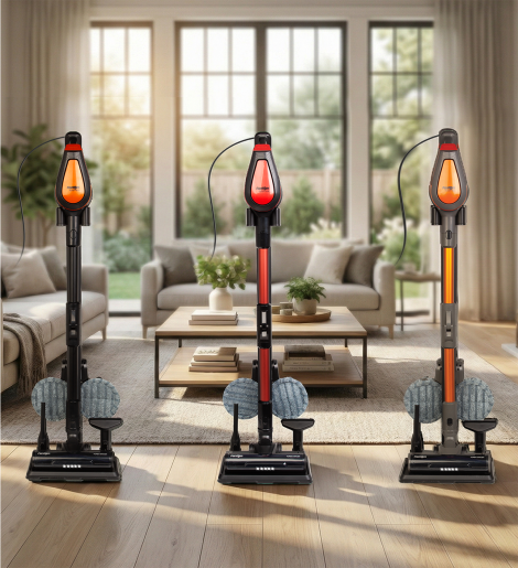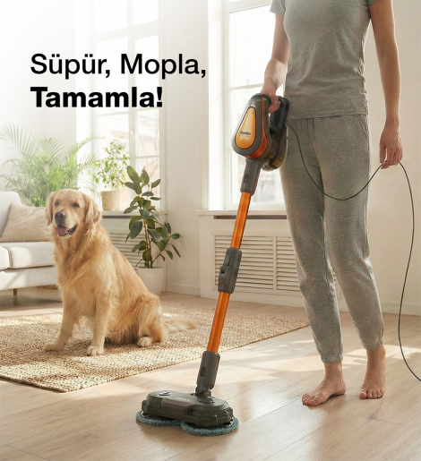 500 W Cyclone teknolojili dikey elektrikli süpürge, güçlü emiş performansı ile etkili temizlik sunar. LED’li motorlu turbo başlığı ve saç dolanmasını önleyen özel fırça tasarımı sayesinde halılarda derinlemesine temizlik sağlar. Ovalayarak silen mop başlığı ve yıkanabilir pedleri ile hijyenik zemin temizliği sunar.