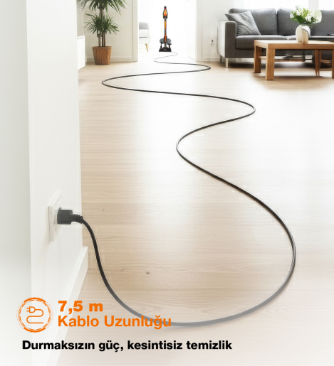 Dar alan aparatları ile her köşeye ulaşır; metal ve HEPA çift filtre sistemiyle temiz hava çıkışı sağlar. 1,3 L toz haznesi, tek tuşla boşaltım özelliği ve 7,5 m kablosu ile pratik kullanım sunar. Katlanabilir metal borusu ve ayaklı stand park özelliği sayesinde ergonomik ve düzenli saklama imkânı sağlar.